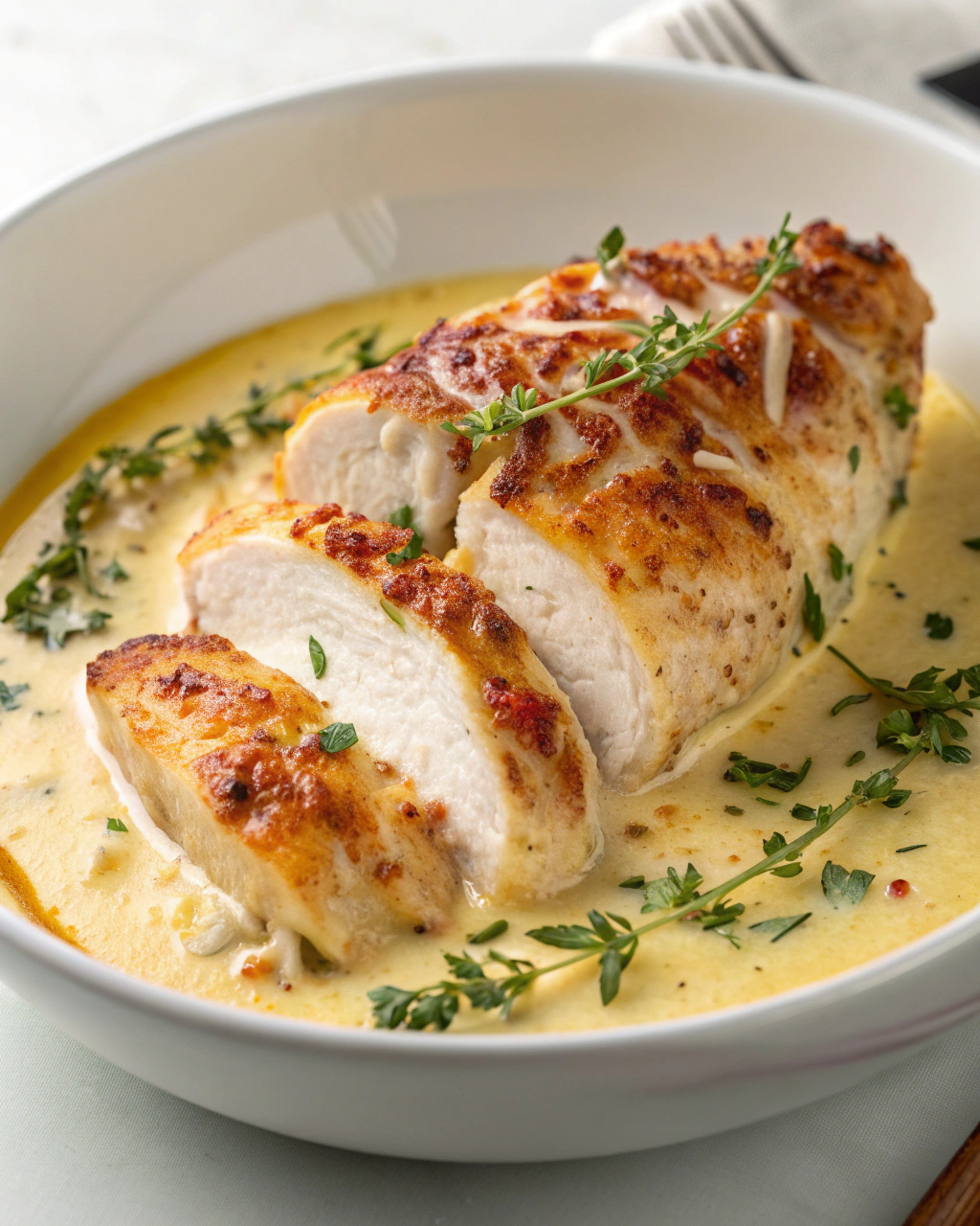 Servez ce poulet nappé de sa sauce onctueuse directement dans une assiette creuse, laissant s’étaler le velouté autour de la viande dorée. Une petite touche de verdure fraîche sur le dessus éclaire la palette de couleurs naturelles. Ce plat simple se marie bien avec une purée de pommes de terre maison ou une salade croquante pour équilibrer la douceur de la crème. Autour de la table, il invite à la convivialité et à la simplicité, comme un doux rendez-vous qui réchauffe plus que le ventre.