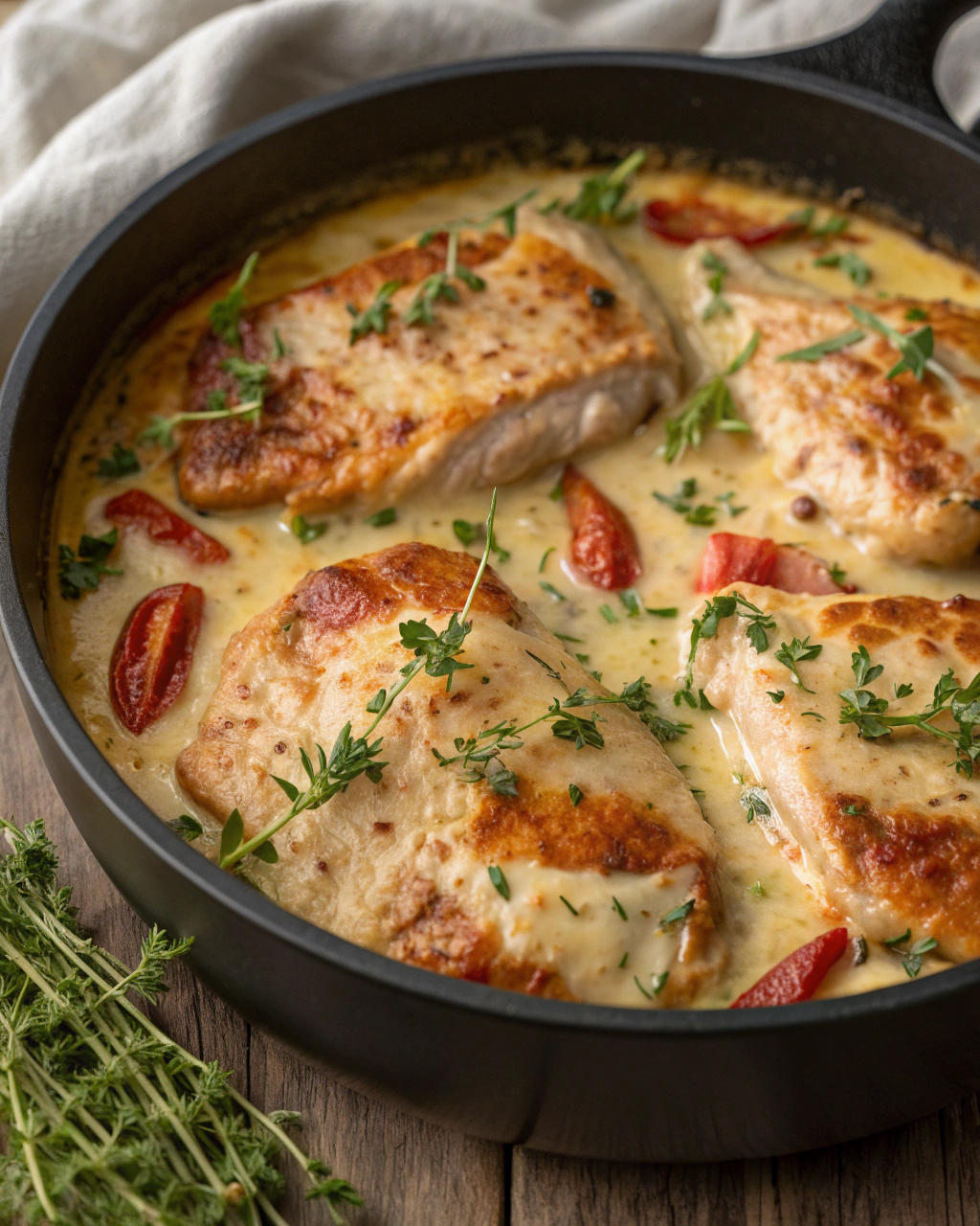 Posez les filets nappés de sauce dans des assiettes creuses pour bien recueillir la crème onctueuse. Quelques petites feuilles de thym ou un brin de ciboulette tombé là sans façon parfument délicatement sans masquer la simplicité du plat. Ce poulet à la crème s’accompagne merveilleusement d’un riz basmati légèrement beurré ou d’une poêlée de légumes saisonniers, qui apporte une touche de couleur et de croquant. Installez une nappe claire, une lumière tamisée, et laissez le repas s’installer en douceur.