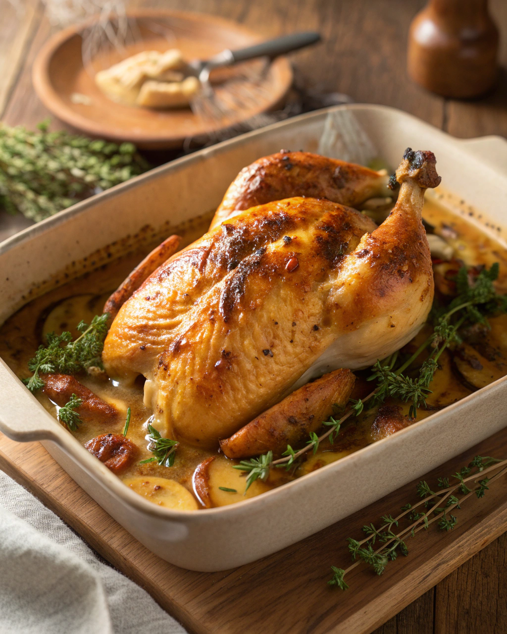 Je me souviens de ce doux après-midi où, en sortant de la cuisine, l’odeur du poulet rôti avait doucement envahi toute la maison. Le parfum chaud des herbes, mêlé à la légère odeur caramélisée de la peau qui croustille, me rappelle une simplicité réconfortante. Ce bruit léger du poulet qui crépite à travers la peau, comme un petit secret de cuisine, invite à la patience. Le four diffuse une chaleur enveloppante, et chaque minute passée à attendre ce moment donne un sentiment de calme, presque méditatif. C’est un plat simple, mais tellement rassasiant, où la texture tendre de la viande s’accorde parfaitement à ce croustillant doré, sans que l’on ait besoin de courir après mille étapes compliquées. Je garde toujours ce souvenir comme celui d’un repas qui rassemble, sans complication, simplement pour le plaisir d’être à table ensemble.