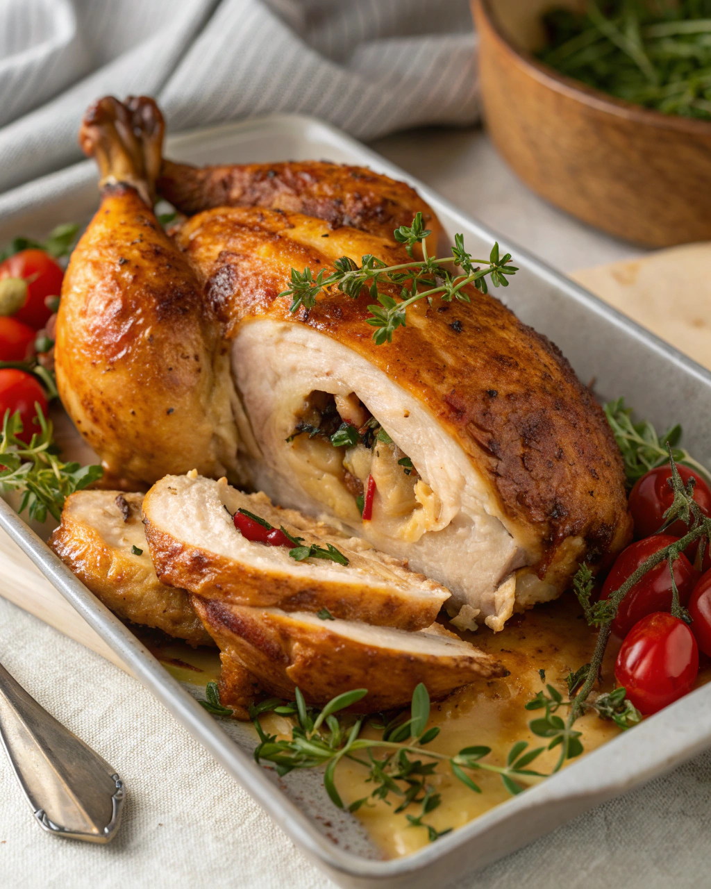 Servez ce poulet rôti dans un plat rustique, quelques branches de thym fraîches déposées sur le dessus pour évoquer sa simplicité champêtre. Le contraste des couleurs, doré et vert tendre, invite à la convivialité. Accompagnez-le d’une purée de pommes de terre maison ou d’une salade croquante, pour équilibrer la douceur de la chair. Un petit filet de jus de cuisson versé au dernier moment sur l’assiette offre la touche finale, un peu comme un câlin chaud.