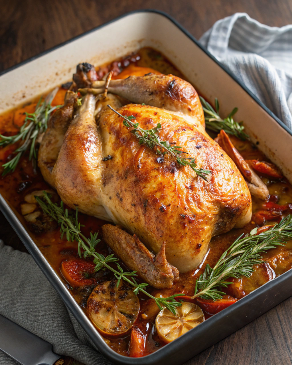 Servez ce poulet rôti avec des légumes de saison rôtis, comme des carottes et des pommes de terre, pour un camaïeu de couleurs chaleureuses. Une salade verte croquante, légèrement acidulée, apportera un contraste frais. Le jus de cuisson caramélisé, recueilli dans le plat, balancé sur la viande juste avant de passer à table ajoute une dimension délicate et naturelle. Autour, un pain rustique croustillant complètera parfaitement ce tableau simple et réconfortant.