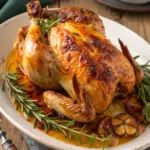 Servez ce poulet doré sur un plat de service, en laissant visible la peau croustillante, accompagnée de légumes colorés rôtis ou d’une simple salade verte légèrement vinaigrée. Le contraste entre le croustillant de la volaille et la fraîcheur des garnitures apporte une belle harmonie. Poser quelques branches d’herbes fraîches sur le dessus ajoute une touche visuelle légère et invite à la dégustation, autour d’une table conviviale et chaleureuse.