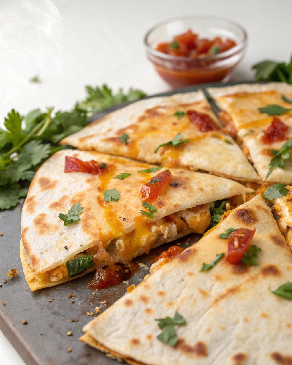 Disposez les morceaux de quesadilla encore tièdes sur une planche en bois ou une assiette claire pour que leur doré délicat ressorte bien. Un peu de coriandre fraîche en garniture apportera un éclat de verdure et une touche de fraîcheur. À côté, une petite sauce au yaourt relevé de citron vert ou une salsa maison viendra compléter les saveurs avec douceur, sans rien écraser. Ce plat se savoure aussi bien en repas décontracté qu’en partage, dans la simplicité d’un après-midi posé.