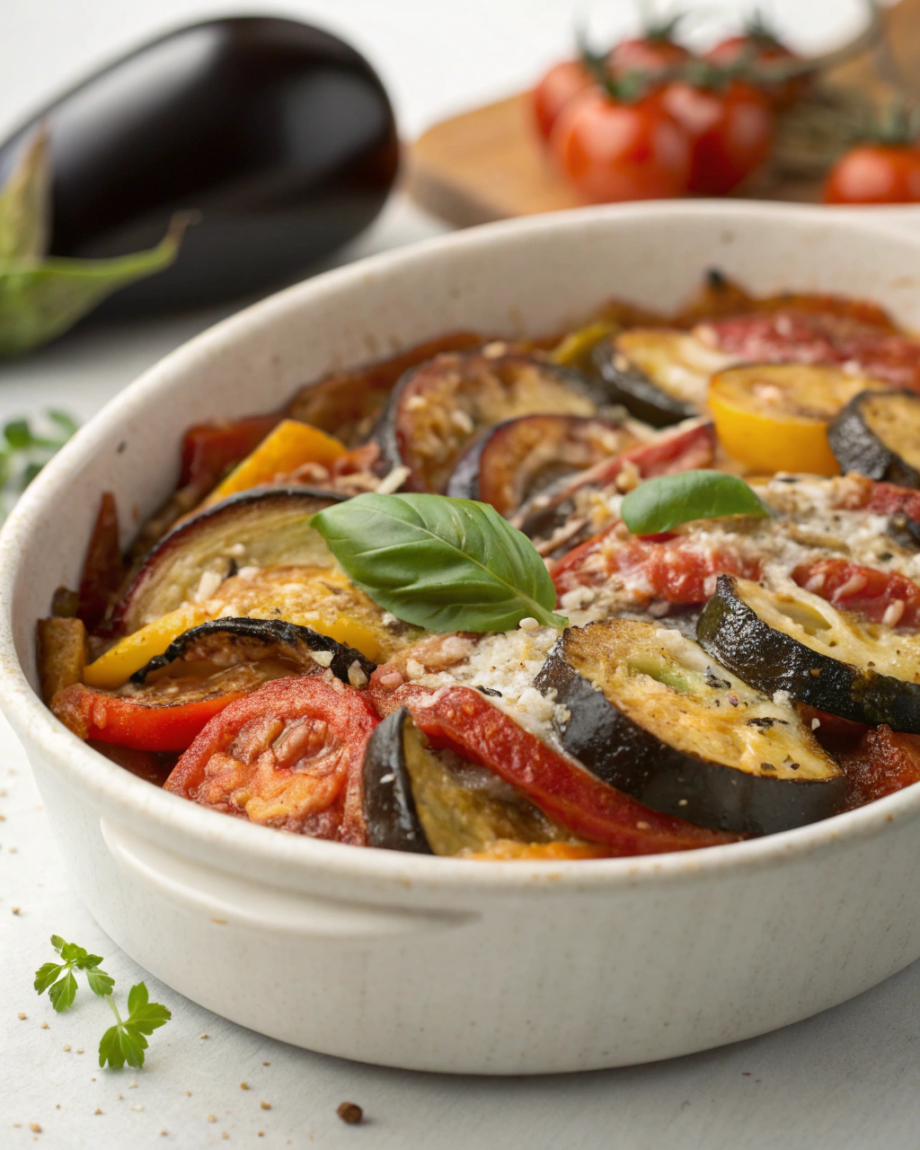 Servez cette ratatouille dans de jolies assiettes creuses, en laissant apparaître les broderies colorées des légumes. Le vert du basilic frais posé sur le dessus apporte une touche de fraîcheur visuelle et aromatique. Ce plat léger s’associe parfaitement à un filet de poisson blanc ou à une tranche de pain de campagne toastée. Autour de la table, la simplicité des saveurs invite à de belles conversations paisibles, dans une ambiance douce et chaleureuse.