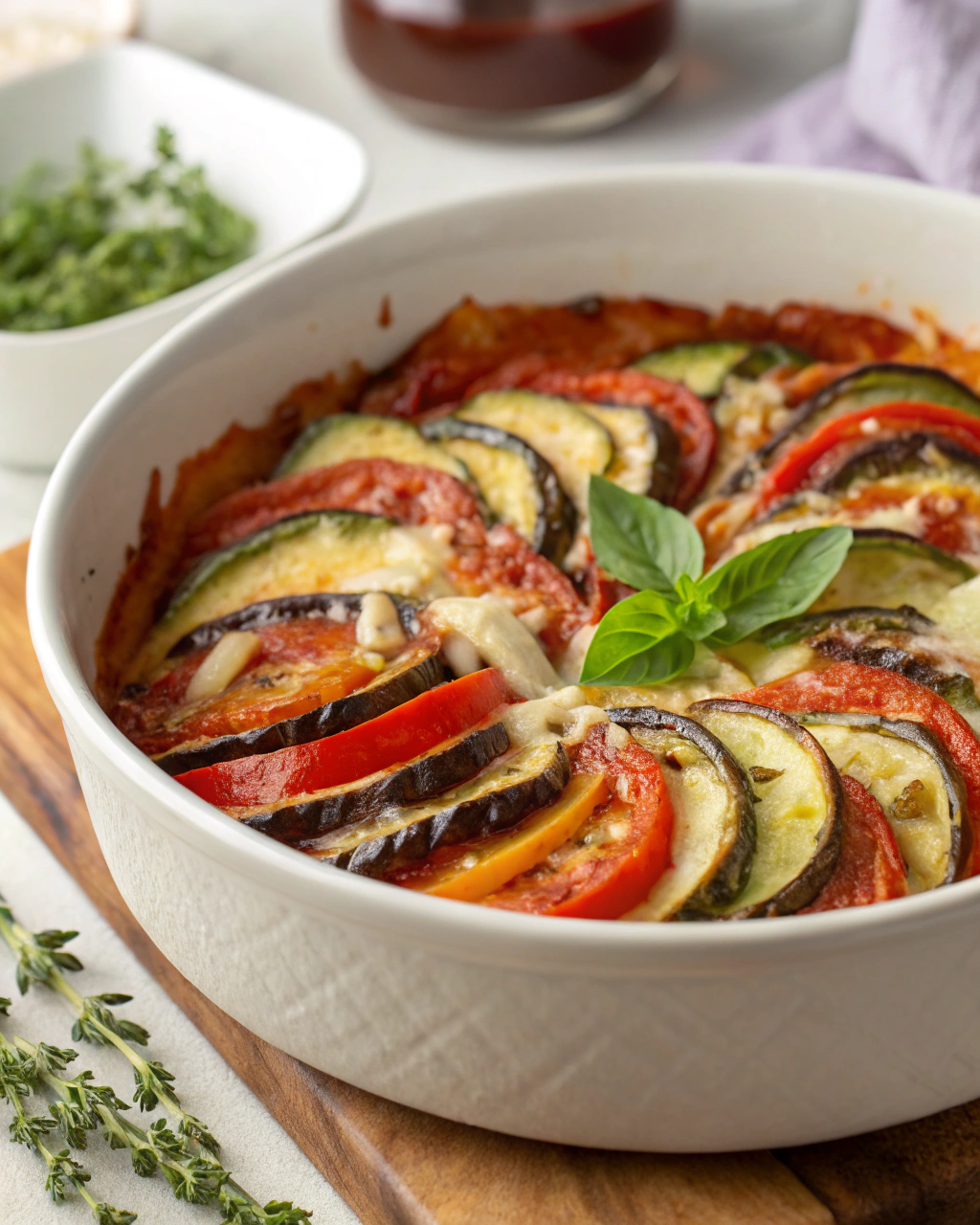 Servez cette ratatouille dans de jolies assiettes larges où les couleurs des légumes s’étalent naturellement, apportant ce charme rustique et lumineux. Quelques feuilles de basilic frais par-dessus ajoutent une touche de verdure et de fraîcheur visuelle. Elle s’accorde parfaitement avec un filet de poisson blanc grillé ou quelques tranches de pain frais, idéal pour profiter pleinement des saveurs sans alourdir le repas. L’ensemble évoque un moment simple, chaleureux, à partager sans retenue.