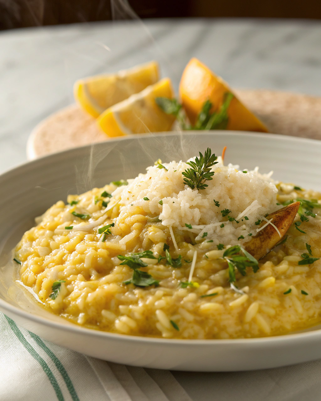 Servez ce risotto dans de jolis bols blancs ou des assiettes creuses, pour faire ressortir la couleur crème parsemée de zestes lumineux. Accompagnez-le d’une salade verte croquante ou d’un plat de légumes rôtis aux thym frais, pour créer un joli contraste de textures et de goûts. La simplicité et la fraîcheur de ce plat invitent à un repas sans prétention, où chaque bouchée se savoure comme un petit moment de tranquillité.