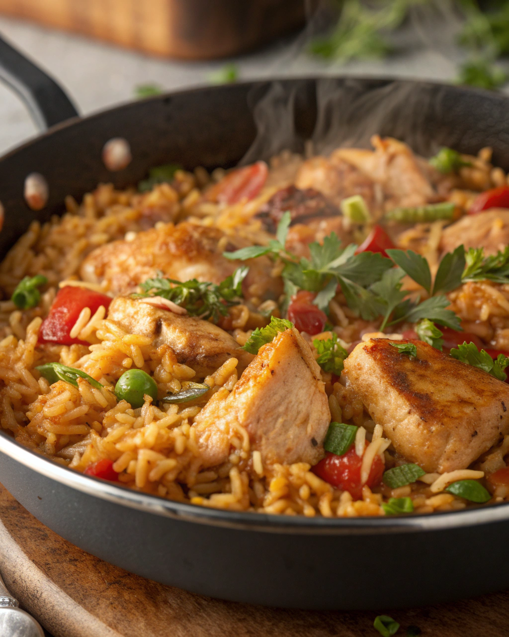Je repense souvent à ce moment précis, quand le riz se met à légèrement crépiter dans la poêle, enveloppant la cuisine d’une douce odeur de cuisson mêlée aux arômes du poulet et des épices. Ce plat, je l’ai préparé un soir d’automne, la lumière douce traversant la fenêtre, pendant que tout mijotait doucement. Le bruit des légumes qui fondent, la chaleur diffusée par la sauteuse, puis ce petit goût umami qui se développe quand le bouillon imbibe chaque grain de riz… C’est une expérience humble mais réconfortante, où chaque cuillerée ramène ce sentiment simple d’un repas fait maison, généreux et sincère.