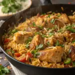 Servez ce riz au poulet chaud, directement dans un plat creux pour garder la chaleur. La couleur vive du poivron rouge contraste joliment avec le jaune doré du riz, et les touches de persil apportent un éclat de verdure. Accompagnez-le d’une salade verte simple ou d’une poêlée de légumes sautés pour un repas complet, équilibré, où chaque bouchée réchauffe tranquillement l’âme.