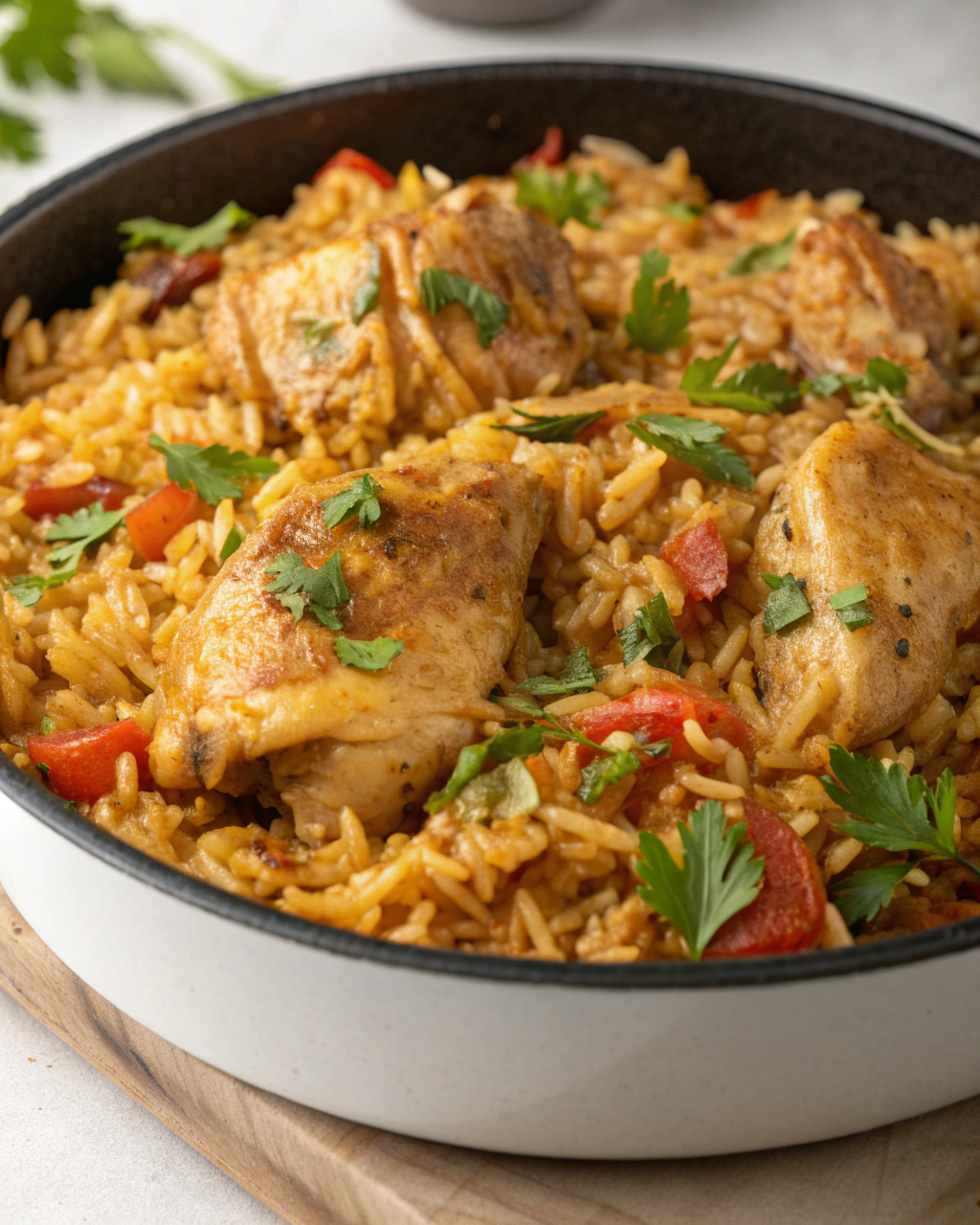 Servez ce riz au poulet dans un plat chaleureux où les couleurs citronnées du poivron et du persil tranchent joliment avec la douceur rousse du riz et du poulet. Sur la table, une simple nappe claire et une lumière douce suffisent, laissant la chaleur du plat parler pour elle-même. Un peu de salade verte ou un légume vapeur se marient parfaitement, apportant un équilibre tout simple, sans prise de tête.