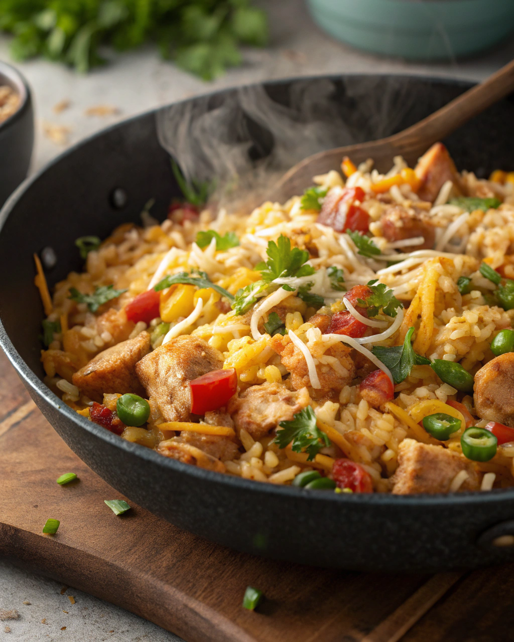 Je me souviens d’un soir un peu pressé, où l’envie d’un plat simple mais réconfortant m’a poussé devant ma poêle, sans grande attente. Le bruit léger du riz qui crépite doucement contre le fond huilé, le parfum doux de l’ail et des petites touches de légumes frais qui sautent rapidement à la chaleur : c’était à la fois apaisant et vivant. Ce riz sauté n’est pas celui des restaurants, il a cette simplicité presque intime, où chaque bouchée murmure un souvenir de cuisine maison. Le croquant discret des légumes équilibre la douceur du riz, et la pointe de sauce soja vient jouer un rôle en douceur, un peu salé, un peu noisette. C’est un plat qu’on prépare souvent quand le temps manque mais que l’envie de manger quelque chose de chaud, de maîtrisé et de rassurant est là.