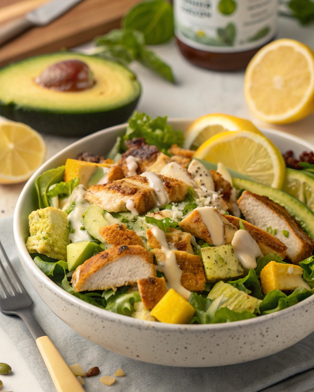 Servez cette salade dans des assiettes larges où les couleurs s’épanouissent naturellement : le vert tendre des avocats, l’éclat citronné du zeste et la légère teinte dorée du poulet. Elle s’accompagne très bien d’un pain rustique légèrement grillé, dont le croustillant complète le croquant de la salade. Posez-la dans une ambiance décontractée, avec une lumière douce et une musique légère en fond, pour un dîner où la simplicité rime avec sérénité.