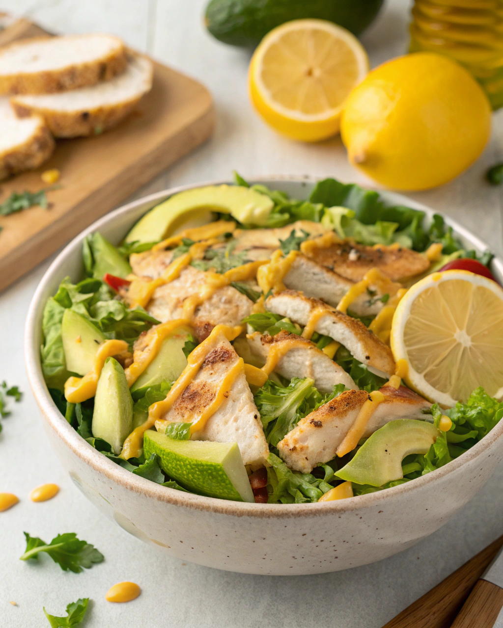 Servez cette salade dans une assiette creuse ou un bol à la couleur douce, pour faire ressortir les contrastes du poulet doré, de l’avocat vert tendre et des légumes croquants. La texture alerte de la mâche mêlée à la douceur généreuse de l’avocat compose un joli camaïeu de fraîcheur. Elle s’accompagne très bien d’un pain complet légèrement toasté, ou d’un verre de vin blanc léger pour ceux qui aiment. Le citron illumine l’ensemble sans écraser les saveurs, donnant à ce plat un caractère simple et délicat à la fois.