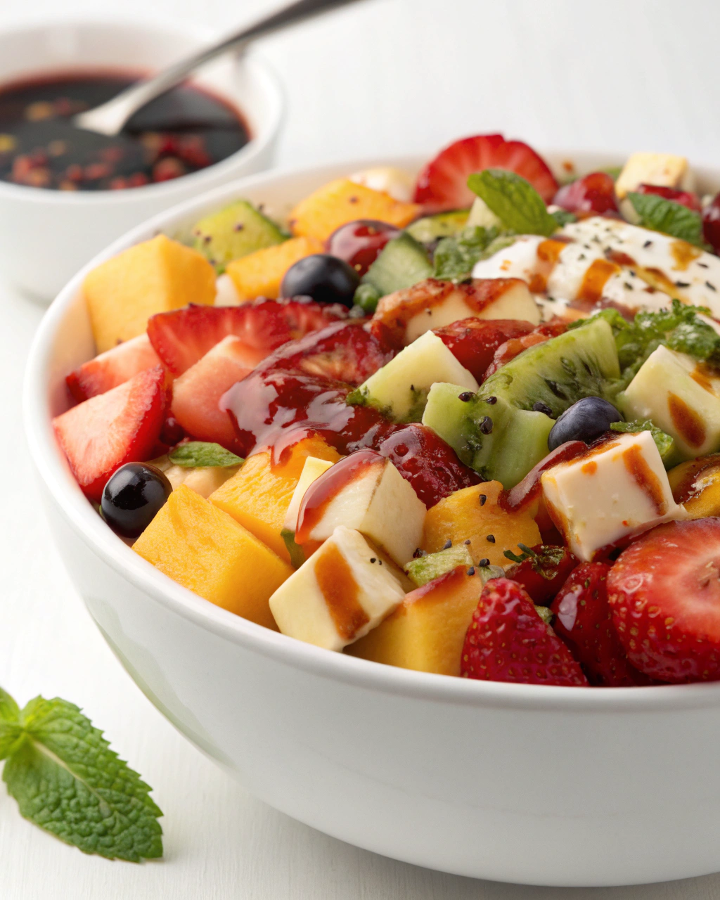 Servez votre salade de fruits dans des petits bols transparents afin que les couleurs éclatantes jouent avec la lumière. Quelques feuilles de menthe déposées par-dessus et une rondelle fine de citron vert sur le bord du récipient apportent une touche d’élégance toute simple. Cette fraîcheur fruitée se marie parfaitement avec une soirée légère, accompagnée d’un thé vert ou d’une tisane florale. Elle invite à ralentir, à savourer chaque bouchée dans une ambiance douce et décontractée.