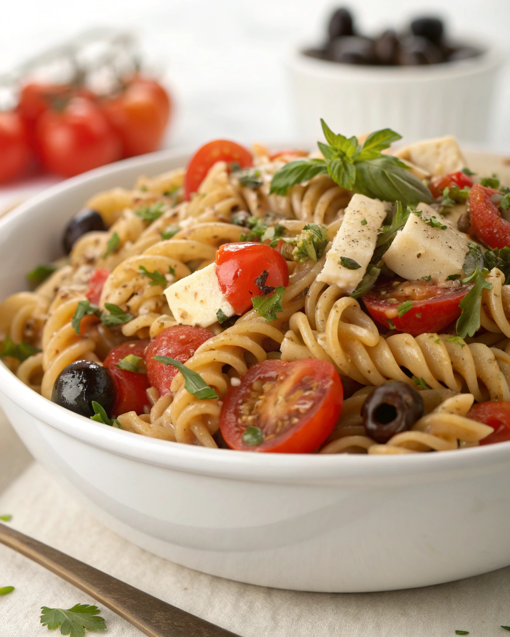 Servez cette salade de pâtes dans un grand plat aux couleurs chaudes, où le rouge des tomates et du poivron contraste joliment avec le vert vif du basilic. Posez-la sur la table d’un déjeuner en terrasse, accompagnée d’un pain maison croustillant, et d’un léger filet d’huile d’olive à disposition. La simplicité du plat invite à une ambiance détendue, presque comme un petit instant suspendu, savouré avec douceur.