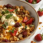 Servez cette salade dans un grand plat clair pour que la lumière joue avec les couleurs vives des tomates cerises et du vert des herbes. La texture du quinoa légèrement doré contraste joliment avec le croquant des noix de cajou et la fraîcheur du citron. C’est un plat simple qui trouve naturellement sa place sur une table légère, accompagné d’un filet d’huile d’olive supplémentaire ou d’une tranche fine de pain complet grillé. Le tout suggère une ambiance décontractée, où chaque bouchée invite à une respiration douce au milieu de la journée.