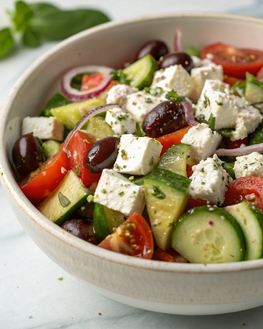 Servez cette salade dans un grand plat aux teintes claires, où les rouges des tomates et le vert profond des herbes ressortent comme des touches de peinture. L’éclat mat des olives et le blanc cassé de la feta viennent remplir le tableau. Déposez quelques feuilles fraîches en guise de décoration finale, peut-être une tranche de citron en coin pour la lumière. Ce plat léger accompagne parfaitement un poulet grillé ou un poisson poché, et invite à une pause sans prétention, accompagnée d’un vin rosé frais ou d’une eau pétillante parfumée aux agrumes.