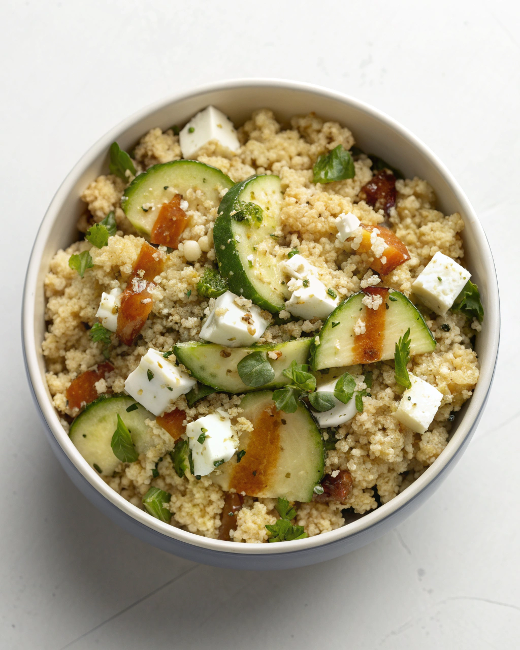 3. Dans un grand saladier, émiette la feta à la main, afin de garder des morceaux irréguliers qui fondent doucement sous la dent. Ajoute ensuite le quinoa tiède, les dés de concombre, et mélange délicatement pour ne pas écraser les ingrédients.