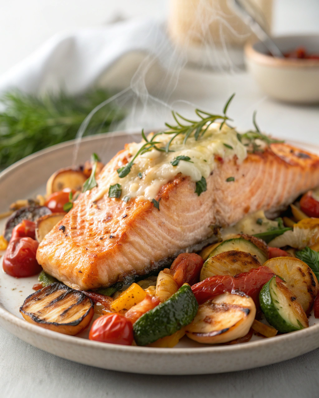 Servez ce saumon doucement rosé posé sur un lit coloré de légumes dorés, juste tièdes, où les courgettes vertes et les carottes orangées apportent de la fraîcheur visuelle. Le citron et les herbes fraîches déposés sur le dessus finiront de réveiller le plat, apportant une note légère et parfumée. Accompagnez d’un riz basmati ou d’un peu de quinoa pour équilibrer, et d’un verre de vin blanc léger pour prolonger cette simplicité qui réchauffe sans effort.