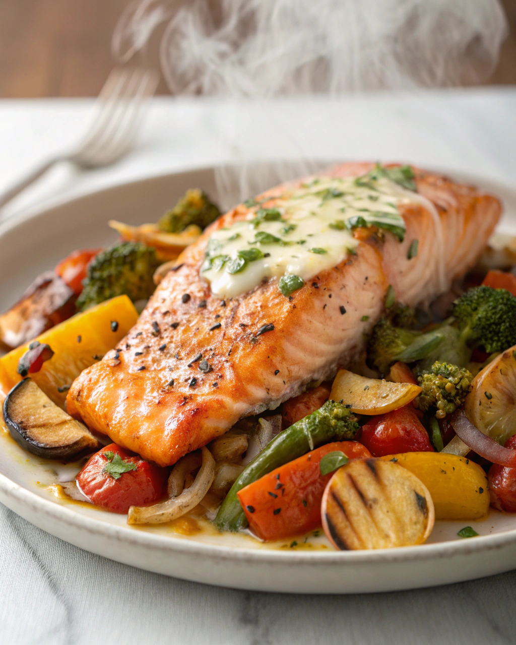 Saumon au four + légumes rôtis (textures croquantes)
