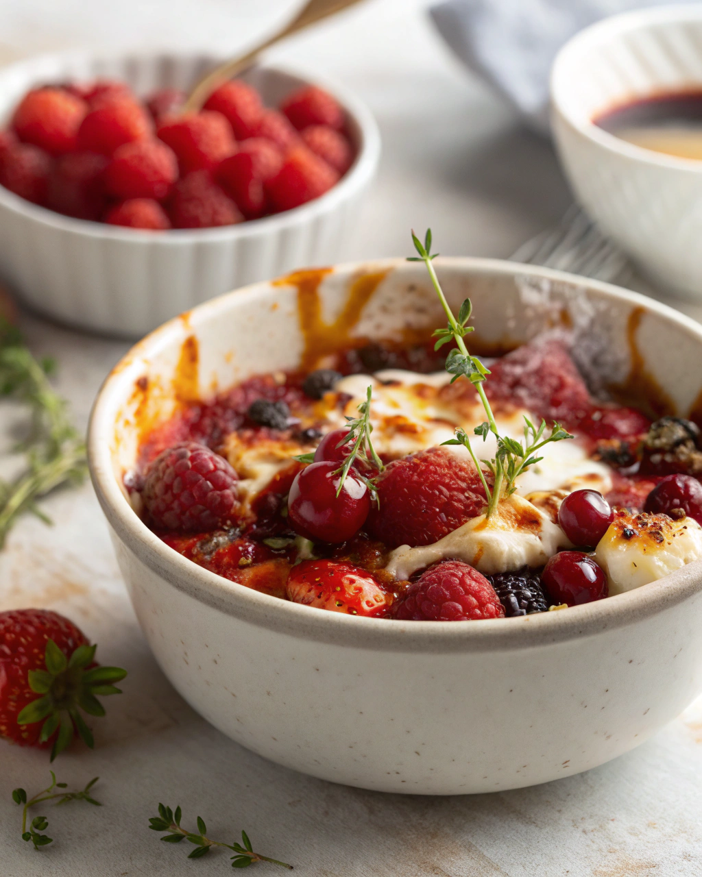 Servez ce skyr aux fruits rouges dans des petits bols en céramique naturellement colorés, la douceur blanche du lait fermenté contrastant joliment avec les éclats rouges et bleus des fruits. Quelques feuilles de menthe posées simplement sur le dessus rappellent la fraîcheur du matin. Pour un élan gourmand, accompagnez ce dessert d’un thé vert léger ou d’une infusion florale, et profitez de ce moment simple, presque suspendu.