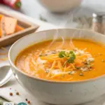 Servez cette soupe dans des bols simples, où la couleur orangée des carottes et la teinte verte des lentilles se marient en douceur. Une cuillère de crème fraîche ou un filet d’huile d’olive sur le dessus apporte une touche de gourmandise discrète. L’idéal est de l’accompagner de tranches de pain de campagne légèrement grillées, pour grignoter avec plaisir. Installez-vous dans une lumière tamisée, avec un plaid à portée de main — ce plat s’apprécie mieux au calme, quand on peut laisser l’esprit voyager entre les arômes et la chaleur qui remonte du bol.
