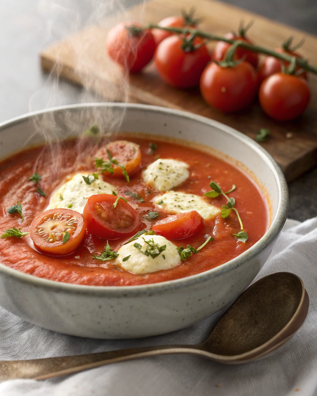 Je me souviens encore de ce moment, en fin d’été, quand les tomates du jardin commencent à rougir doucement sur les pieds, lourdes de promesses. Ce jour-là, la cuisine s’est embaumée d’une douce odeur de tomates confites, mêlée à l’ail doucement doré dans l’huile d’olive. Le petit bouillonnement tranquille de la soupe dans la casserole, rythmé par le léger crépitement des tomates qui éclatent sous la cuisson, apportait une chaleur réconfortante à la pièce. En mixant le tout, la texture devient veloutée, presque soyeuse, et le mélange des saveurs fraîches et profondes invite à un instant de pure simplicité. C’est une recette qui ne triche pas, qui ramène à l’essentiel : la douceur des tomates, un soupçon d’herbes, et ce goût à la fois rustique et tendre qu’on savoure avec un silence complice.