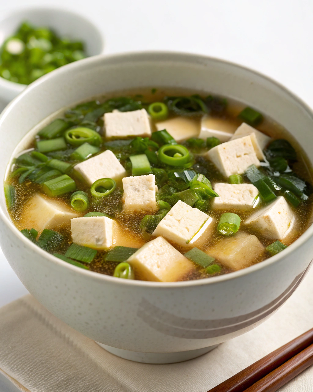 Servez la soupe dans de petits bols en porcelaine, en jouant sur la simplicité et les couleurs naturelles : les vertes tendres des oignons et du wakame contrastent joliment avec le blanc du tofu. Elle s’apprécie en toute tranquillité, accompagnée d’un peu de riz vapeur si l’on souhaite un repas plus complet. Un moment suspendu, où la douceur du bouillon invite à ralentir et à savourer la simplicité d’un plat sain et apaisant.