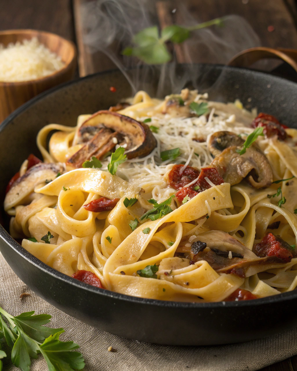 La douceur des champignons sautés associée à l’onctuosité de la sauce vient enrober parfaitement les tagliatelles al dente. Le parfum délicat qui se dégage à la cuisson invite à un moment chaleureux et réconfortant, idéal pour un repas simple et savoureux.