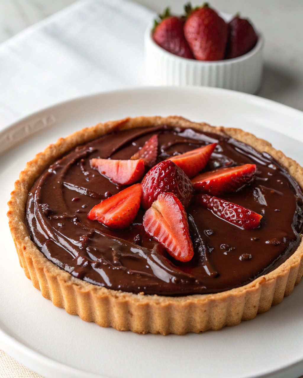Servez cette tarte avec un léger voile de sucre glace tamisé sur le dessus, qui vient contraster délicatement avec la profondeur du chocolat. Un bouquet de feuilles de menthe fraîche ou quelques éclats de fleur de sel ajoutent une touche de fraîcheur et une pointe d’originalité. Posée sur une assiette aux tons neutres, elle se prête aussi bien à un goûter paisible qu’à une fin de repas apaisante. Accompagnez-la d’une crème fouettée maison ou d’une boule de glace vanille pour un mariage tout en douceur.