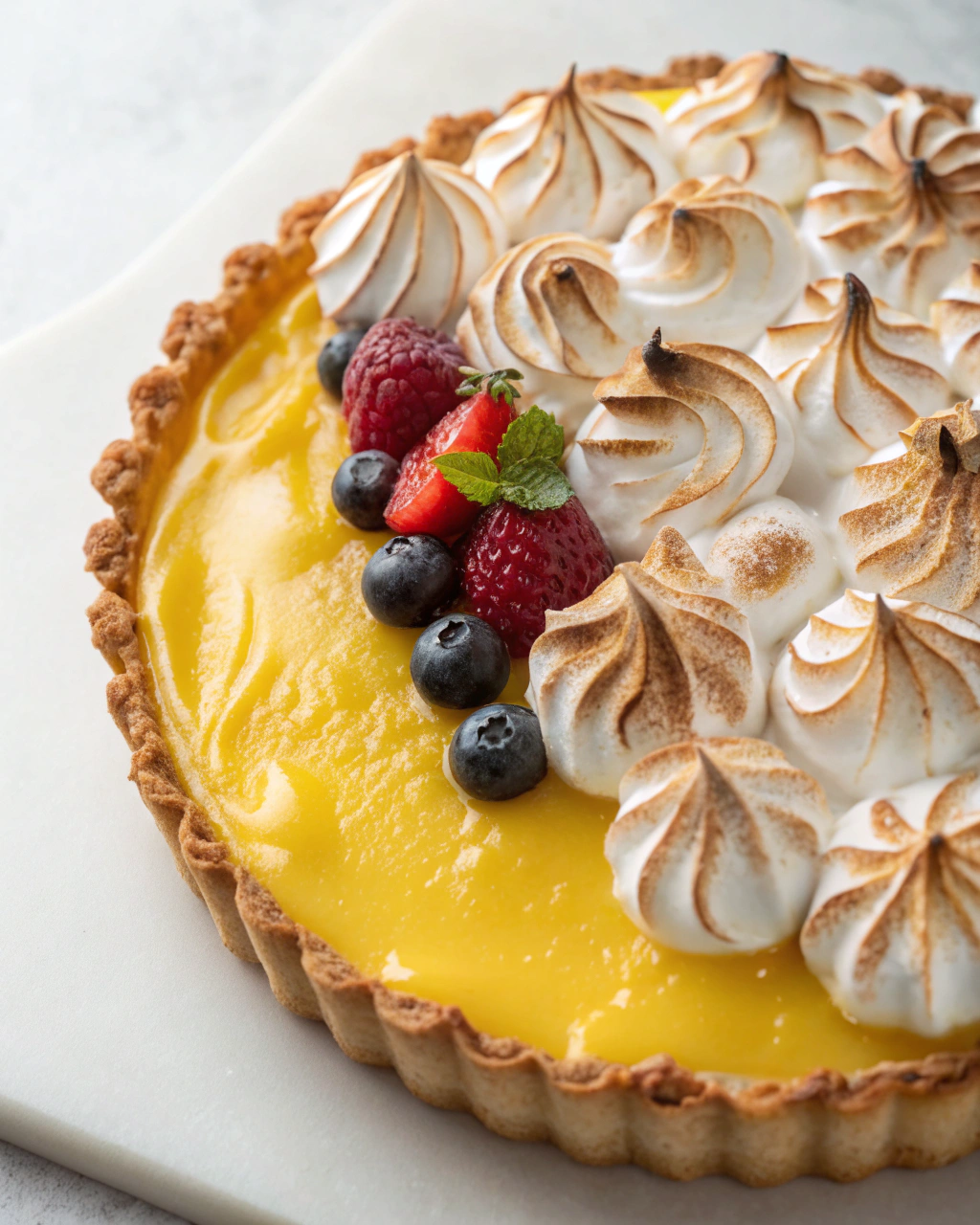 Servez cette tarte sur une assiette claire, pour que sa meringue blanche et ses touches dorées ressortent bien. Accompagnez-la d’une petite tasse de thé noir ou d’un café léger qui soulignera la vivacité du citron sans écraser la douceur. Son équilibre entre fraîcheur et douceur crée une ambiance apaisante, parfaite pour un goûter en fin d’après-midi. Posée sur une table en bois naturel, elle invite à une pause simple et sincère, loin du tumulte.