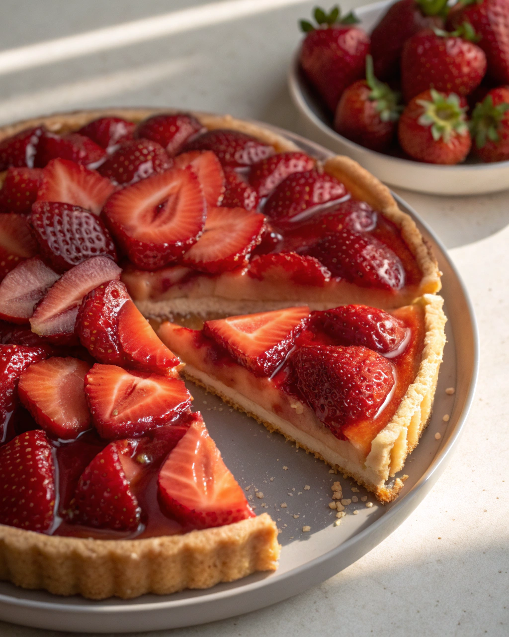 Posez cette tarte sur une table en bois, l’éclat rouge des fraises captant la lumière naturelle du jour. Quelques petites feuilles de menthe fraîche déposées à la dernière minute apportent un petit souffle coloré et une fraîcheur surprenante. Servie avec un thé léger ou un verre de cidre doux, elle invite à un moment simple, sans précipitation. Chaque part se découpe doucement, révélant la fine couche de crème nappée d’un tartare acidulé venu du jardin.