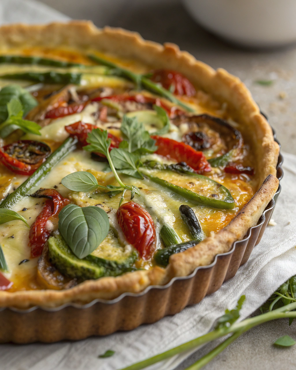 Servez cette tarte aux légumes tiède, idéale pour les soirées où l’on prend le temps de savourer chaque bouchée. La pâte dorée contraste joliment avec les couleurs vives des légumes, tandis que le fromage apporte une touche de douceur crémeuse. Accompagnez-la d’une petite salade verte assaisonnée à l’huile de noix et au vinaigre balsamique, simple et fraîche, pour jouer sur l’équilibre des textures et des saveurs. Elle s’installe sans chichi au centre de la table, invitant chacun à se servir dans la bonne humeur et la simplicité.