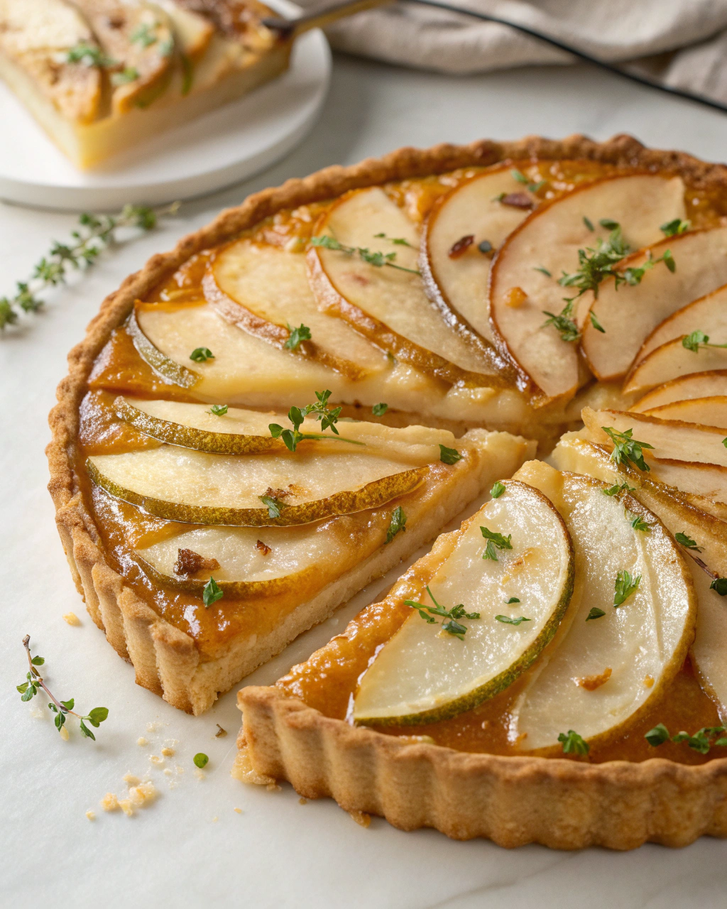 Je me souviens encore du petit matin où j’ai préparé cette tarte pour la première fois. La cuisine était baignée d’une lumière douce et la chaleur du four réchauffait agréablement la pièce. Dès que la pâte a commencé à dorer, un parfum d’amandes grillées s’est répandu, mêlé à cette odeur subtile et sucrée des poires qui commençaient à fondre doucement. En coupant les fruits, leur chair juteuse glissait entre mes doigts, promettant une texture moelleuse. Le léger craquement de la pâte sous la lame, la sensation ferme mais tendre des poires fraîches, tout ça m’a donné cette impression simple et réconfortante d’un dessert qui se partage, à savourer sans hâte, avec une tasse de thé ou un café. Cette tarte contient quelque chose de familier, comme un bon souvenir à déguster.