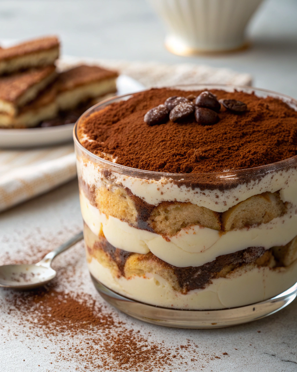 Servez ce tiramisu dans des assiettes creuses ou dans de jolies verrines transparentes, pour laisser apparaître les couches délicates. La surface saupoudrée de cacao apporte ce voile brun qui invite à la douceur. Autour, une ambiance douce, avec une lumière tamisée et une bonne tasse de café pour accompagner, rendra ce moment plus chaleureux. Quelques feuilles de menthe fraîche ou une pincée de chocolat râpé peuvent venir apporter une petite touche de couleur et de fraîcheur. Parfait pour clore un repas en douceur, sans prétention.