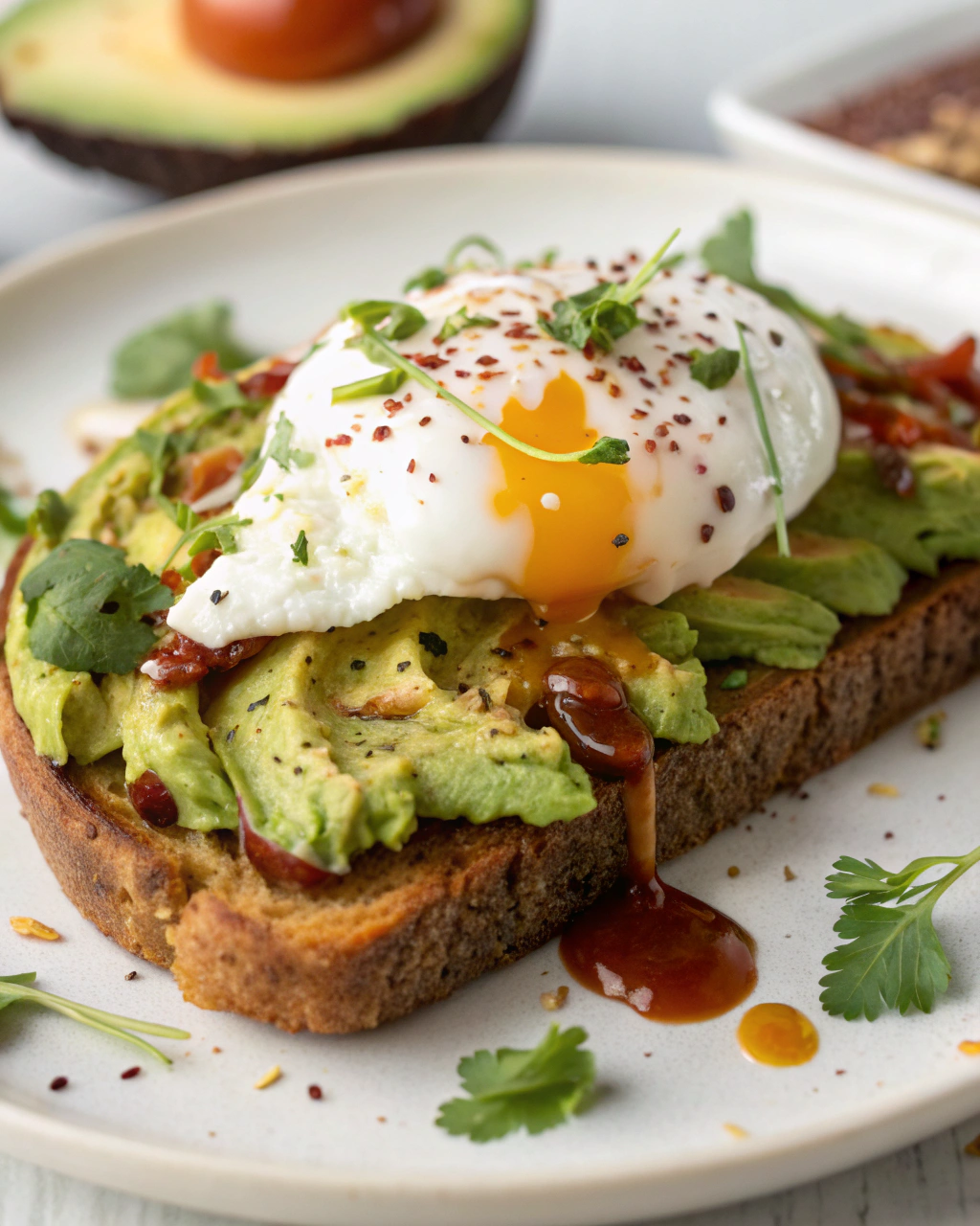 Servez ce toast simplement sur une assiette claire, pour que les verts pâles de l’avocat ressortent chaleureusement aux côtés du jaune brillant de l’œuf. Accompagnez d’une petite salade de roquette ou de jeunes pousses, légèrement assaisonnée pour réveiller le tout. Un café noir ou une infusion posée à côté apporte la touche de réconfort matinale qui complète parfaitement ce moment paisible et gourmand.
