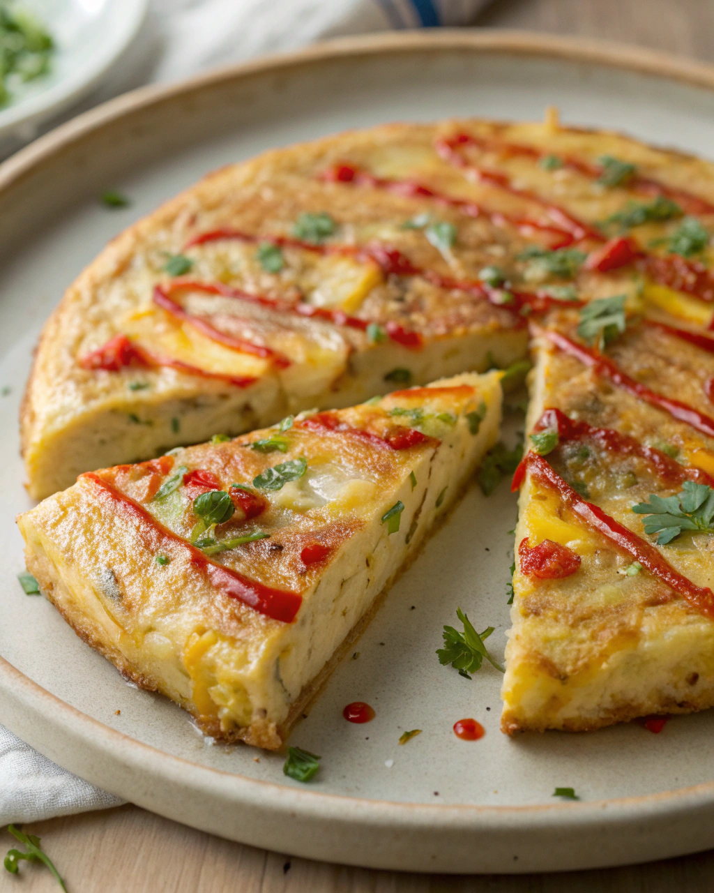 Servez cette tortilla en tranches généreuses, posées sur une assiette simple, où le jaune doux contraste avec le vert vif du persil. Elle s’accompagne parfaitement d’une salade de roquette ou de jeunes pousses agrémentées d’un filet d’huile d’olive et d’un soupçon de vinaigre balsamique. En l’appréciant à température ambiante, elle dévoile toute sa délicatesse et invite à un moment complice, autour d’un déjeuner léger ou d’un dîner sans prétention mais sincère.