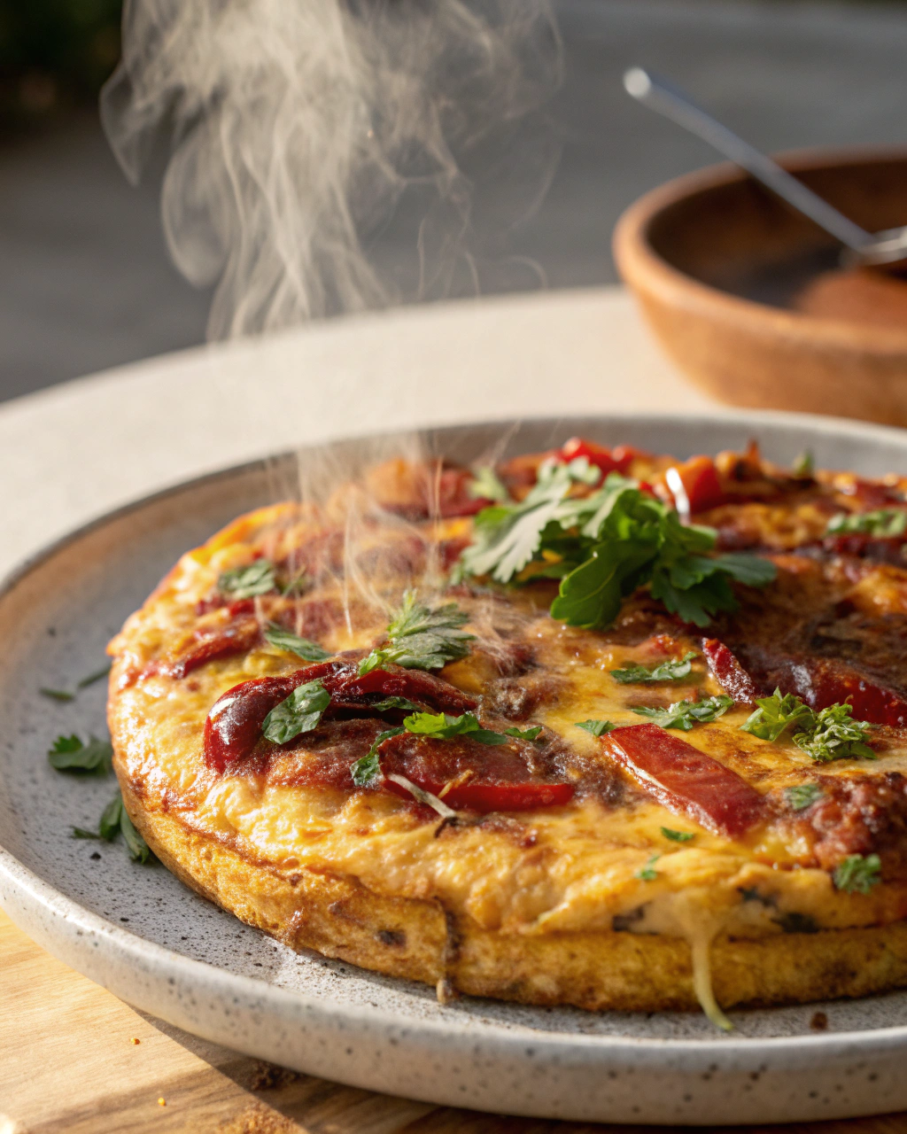 Servez la tortilla tiède, tranchée en parts généreuses, posée simplement sur un plat à partager. Sa teinte dorée met en valeur sa simplicité chaleureuse. Pour accompagner, quelques feuilles de roquette ou une salade verte donnent un peu de fraîcheur, tandis qu’un pain croustillant apporte la touche rustique. Un vin rouge léger ou un verre de vin blanc sec sont tout indiqués pour prolonger ce moment plutôt qu’un repas formel.