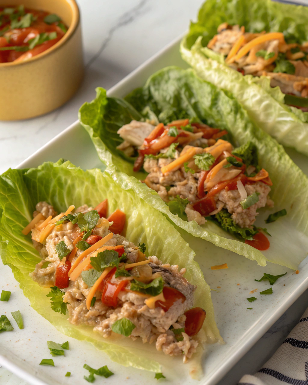 Ces wraps de laitue dévoilent un joli camaïeu de verts et de points rouges si vous ajoutez les radis, une invitation à la simplicité colorée. Posez-les en rang sur une assiette claire ou un plat en bois pour une ambiance naturelle, presque champêtre. Ils s’accordent parfaitement avec une salade croquante ou quelques crudités à côté, pour prolonger le plaisir. La texture fraîche et la douceur du thon créent un contraste doux, qui se prête aussi bien à un déjeuner léger qu’à une entrée tout en délicatesse.