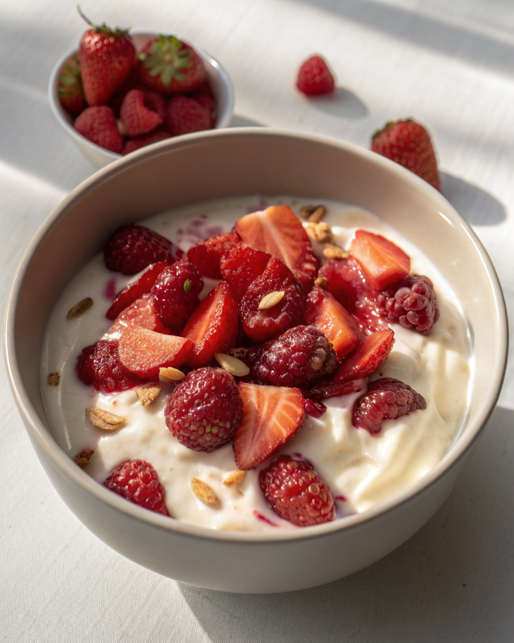 Ce bowl se sert idéalement dans une assiette creuse ou un bol à contours doux, pour accueillir sans éclaboussures le mélange bien équilibré. Les couleurs vives des fruits rouges contrastent avec la blancheur veloutée du yaourt, tandis que les éclats dorés du granola apportent une belle lumière. À table, accompagnez ce dessert ou ce petit-déjeuner d’une tasse de thé vert légèrement fumé ou d’une eau citronnée, et laissez la simplicité des saveurs vous mener tout en douceur vers la journée.