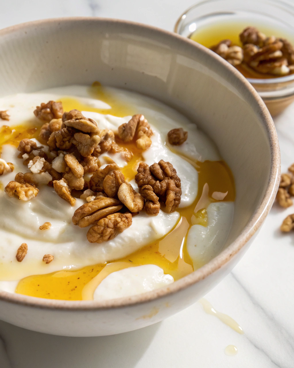 Servez ce yaourt grec miel-noix dans des bols simples, aux couleurs naturelles comme le beige ou le vert olive, pour laisser s’exprimer la douceur claire du yaourt et l’éclat brun des noix. Accompagnez-le d’une petite tasse de thé léger ou d’une infusion au thym pour rester dans une ambiance très douce du matin. Ce contraste de fraîcheur et de croquant invite à la lenteur ; on prend le temps de savourer chaque bouchée, comme un moment volé à la cadence trépidante du jour.