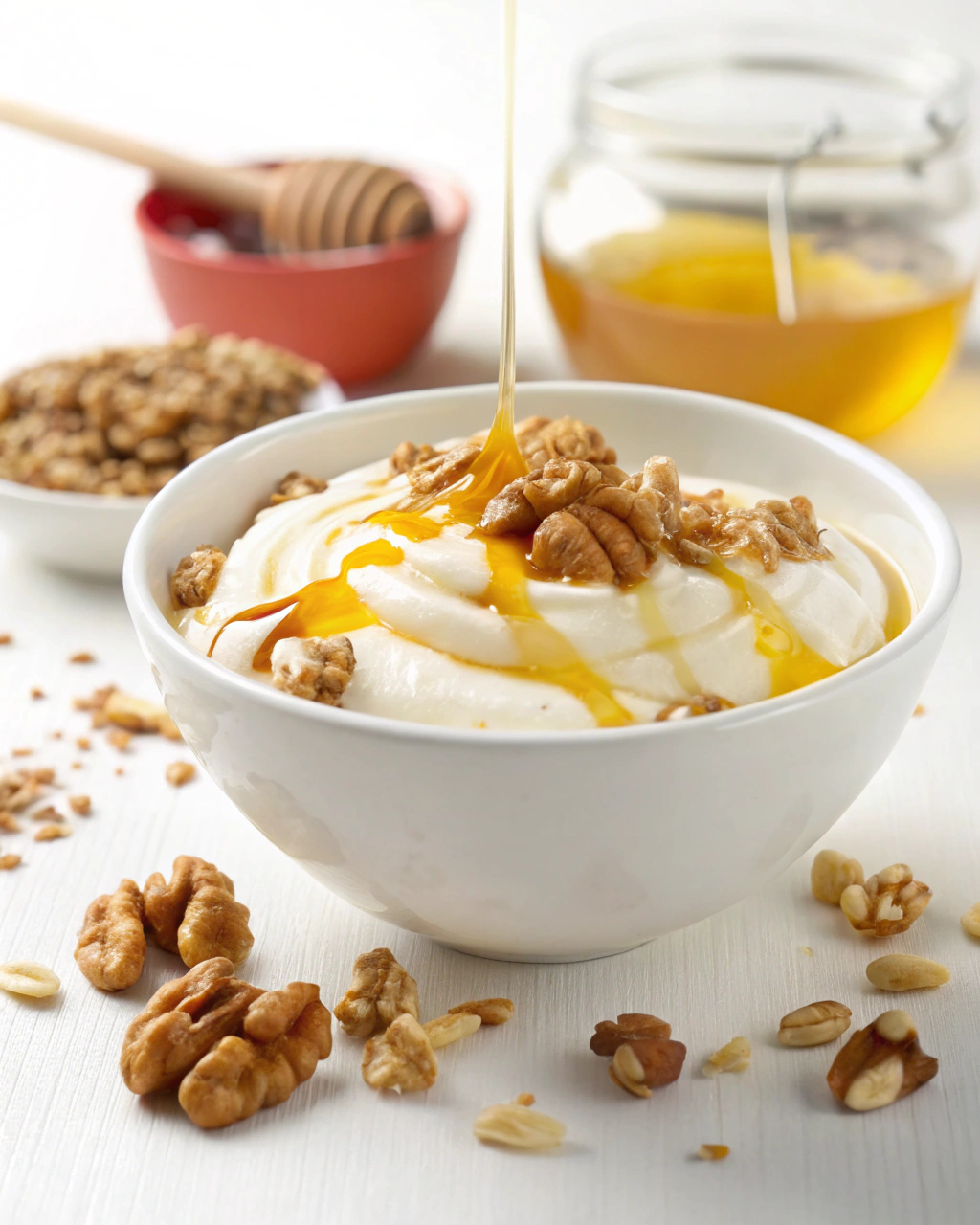 Dépose le yaourt dans des bols en céramique aux teintes neutres pour faire ressortir la couleur dorée du miel et le brun chaleureux des noix. L’ensemble dégage une simplicité un peu rustique, idéale pour un petit déjeuner tranquille ou une pause douceur en milieu de journée. La fraîcheur de la menthe donne une petite touche lumineuse, tandis qu’un thé léger ou un café doux complètent parfaitement ce mélange. C’est un plat qui s’invite autour d’une table calme, où chaque bouchée se savoure tout en se laissant aller à la contemplation.